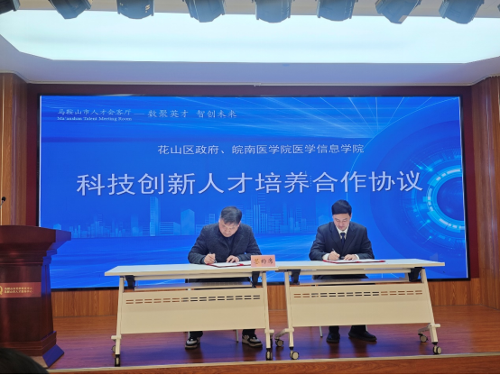 对接会期间,我校医学信息学院与马鞍山市花山区政府签署科技创新人才培养合作协议,双方将在“人工智能+生命健康”产业集群发展领域的科技创新和人才培养方面展开深入合作。同时,马鞍山市人民医院为医学信息学院青年教师颁发“科技导师”证书,进一步推动开展科研合作和指导。