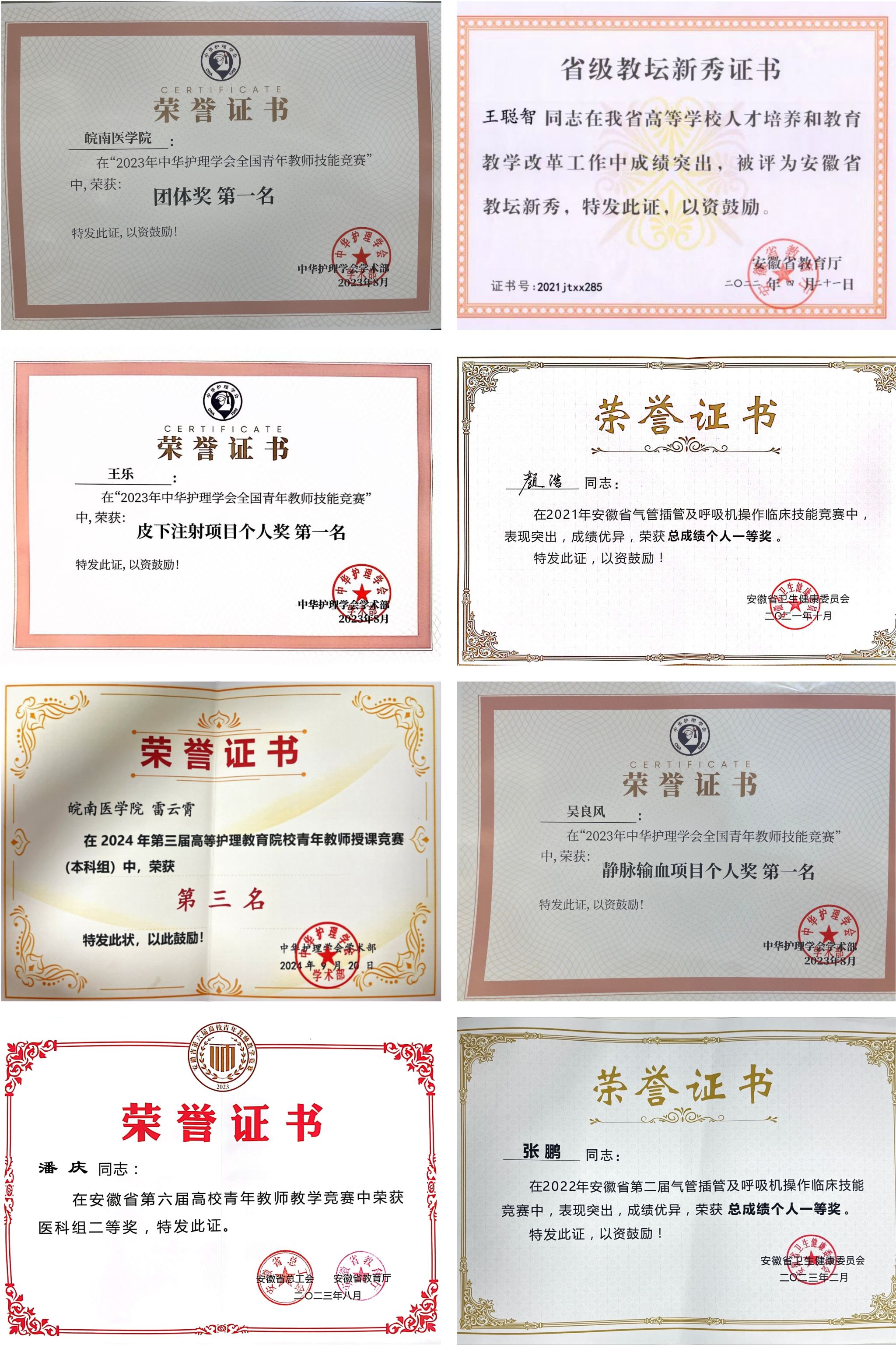 学生在全国首届、第二届护理学专业本科临床技能大赛中先后荣获三等奖、二等奖;2021年获第十届全国大学生技能比赛华东片区赛二等奖;2021年、2024年在安徽省第一、二届护理院校本科学生临床技能竞赛均获团体一等奖,共获9个单项奖;2024年在安徽省第二届正常分娩接产技能大赛中获院校组团体一等奖。