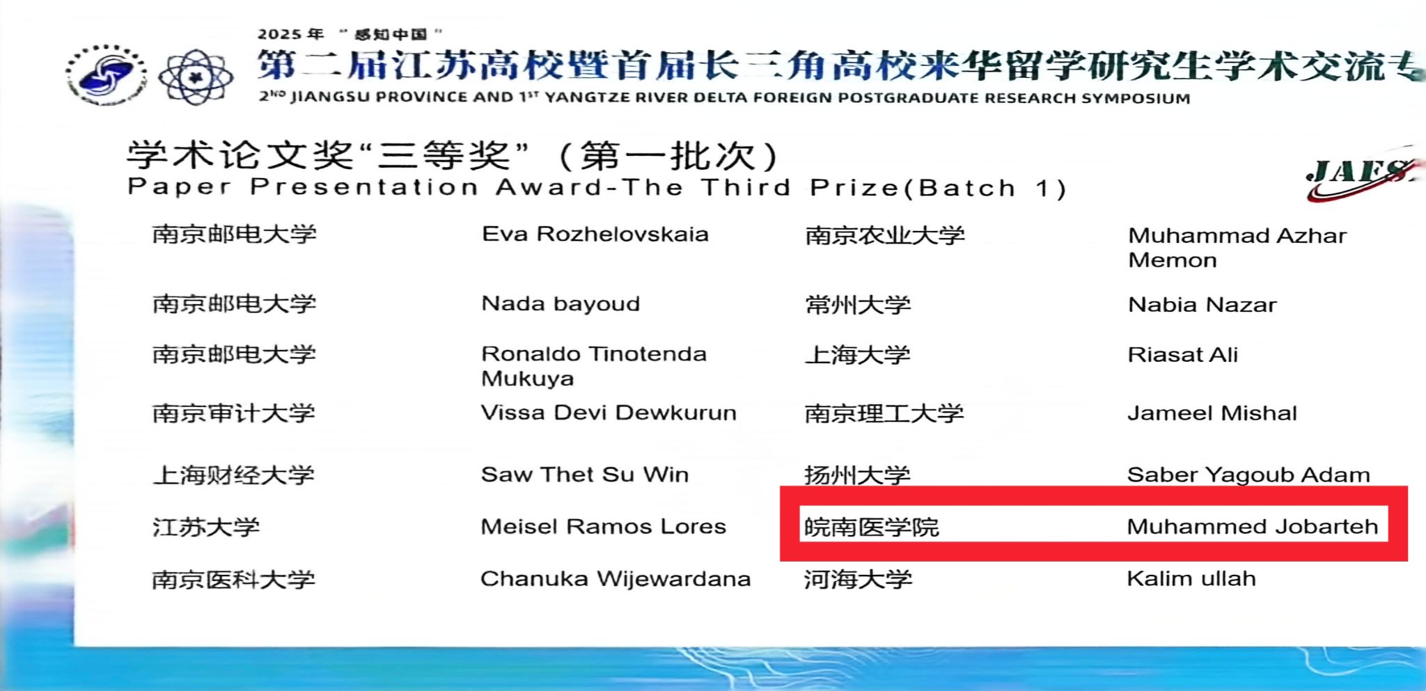 此次获奖不仅是对国际学生个人能力的认可,更是我校国际教育成果与教师团队指导水平的生动体现。未来,我校将继续加强国际学生培养工作,进一步完善教师指导机制,搭建更多学术交流平台,鼓励国际学生与指导老师深度协作,不断提升学校国际教育水平与影响力,为培养更多优秀医学人才贡献力量。(林菁/文、图)