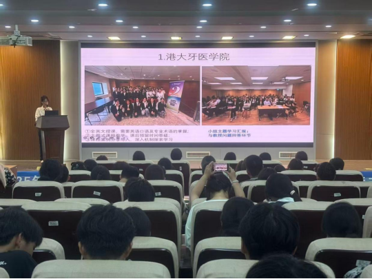 四位同学分别介绍了香港大学牙医学院、英国G5高校、日本东京大学等众多名校的学习项目、师资力量、专业课程安排,分享了自己在研学过程中的所思所感所想所悟,以及在多元环境下的文化感受体验和面对全英环境下的挑战。四位同学表示,此次出国(境)研学活动不仅学习了医学专业在国际环境下的前沿发展,领略到了多元文化氛围,拓展了自己的眼界与认知,同时认识到了自己在专业课学习、英语能力以及创新思维方面的不足,鼓励现场参会同学踏实学习、保持干劲,勇于挑战自我、探索未知。